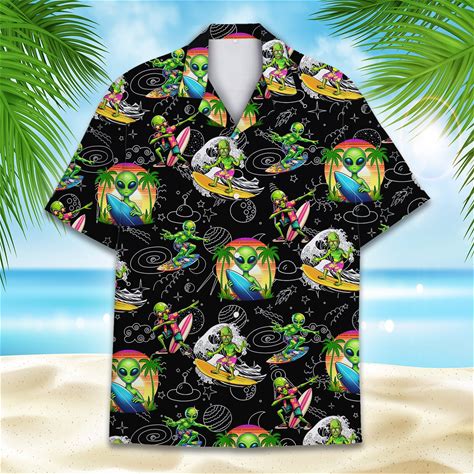 Alien Surfing Hawaiian Shirts, Tropical Summer Beach Aloha Hawaiian Shirts
